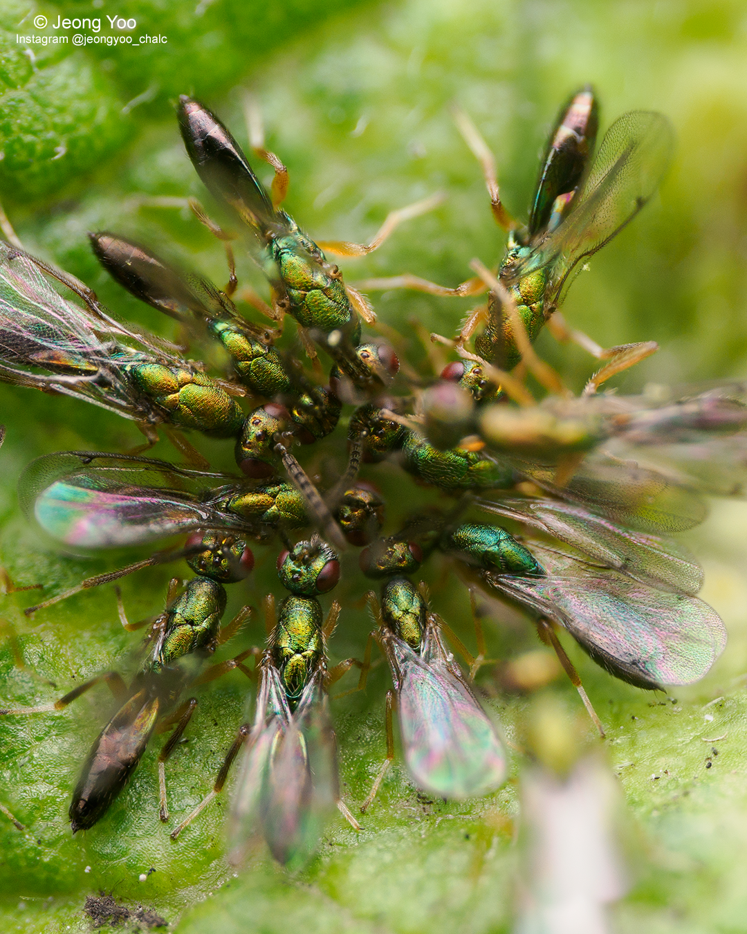 The males of Torymus vesiculi gathered around a hackberry leaf gall, all focused on its center. They were waiting for a female to emerge, waving their antennae in anticipation. Photograph was taken in Ontario, with Olympus OM-1 Mark II and Lawoa 50mm.
